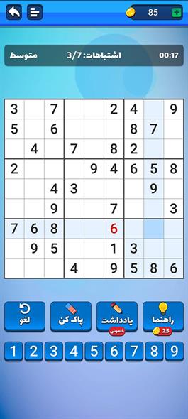 سودوکو: اگر با سودوکو آشنا نیستید؛ بازیکن باید به گونهای اعداد را در جدول قرار بدهد که در هر راستا (عمودی و یا افقی) و یا در هر بخش، اعداد ۱ تا ۹ بدون تکرار قرار بگیرند.